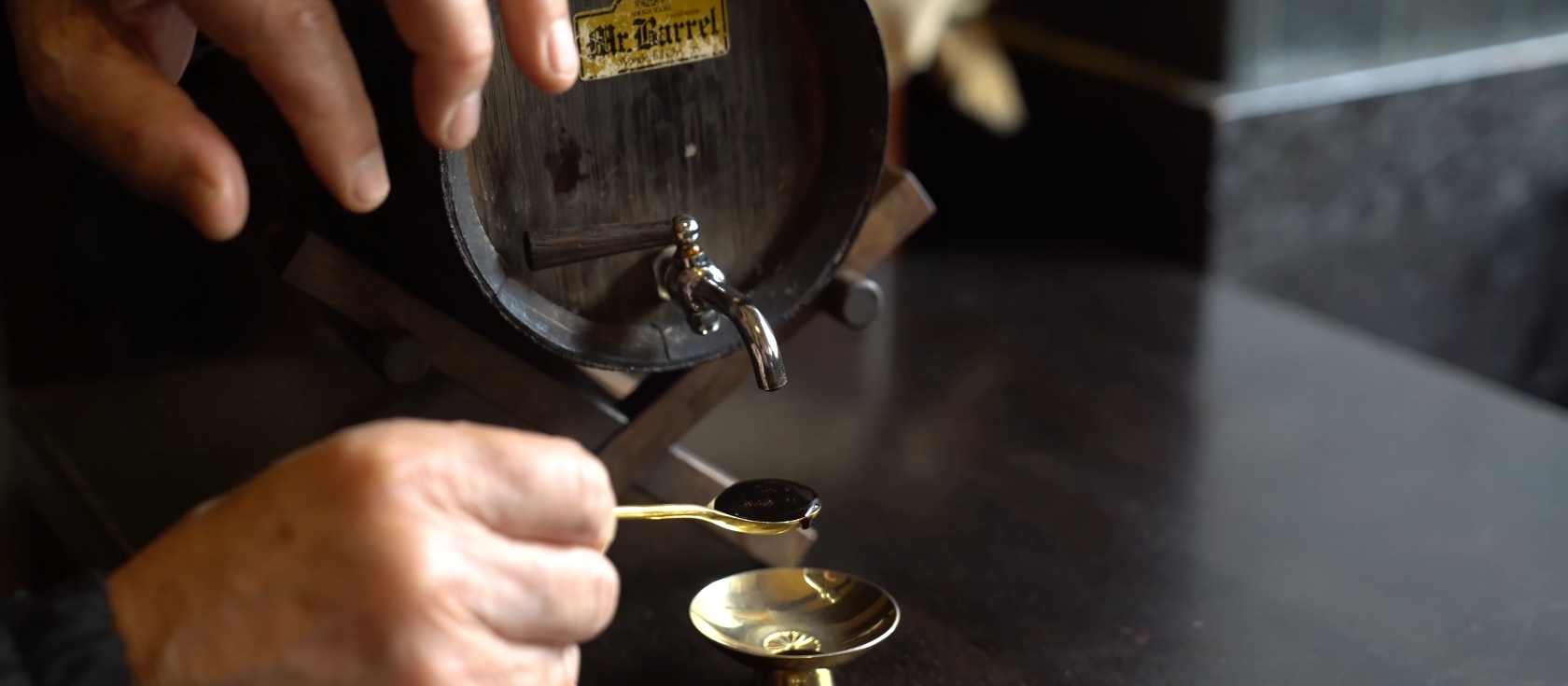 Потом заваренный кофе разливается по дубовым бочкам. Выдержанный кофе наливается прямо из бочек, оснащенных краником. Подают изысканный напиток в специальных чашках из мейсенского фарфора. Говорят, что вкус такого кофе насыщенный и напоминает шоколад.