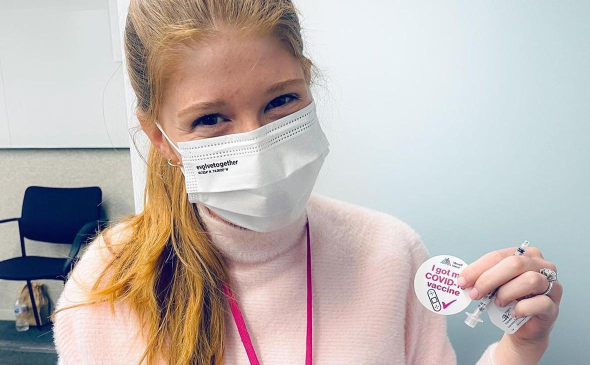 Она написала, что продолжит носить маску и после получения второй дозы вакцины. Также девушка пошутила над теорией заговора о том, что вакцинация — это попытка чипировать людей.