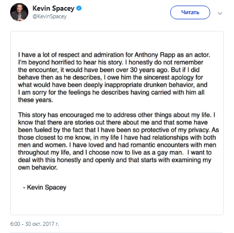 Американский актер Кевин Спейси, известный по сериалу «Карточный домик» признался, что является гомосексуалистом, и имел неосторожность допустить пьяные домогательства к своему коллеге. Об этом он написал в своем Твиттере.