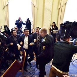 После того как Мельничук решил перейти в группу Еремеева, Ляшко потребовал от него сложить мандат и заявил, что бывшему комбату заплатили, чтобы он присоединился к группе, и она не прекратила свое существование из-за нехватки депутатов. Соратники «радикала» попытались не пропустить айдаровца в сессионный зал. Возникла потасовка. В ней лично принял участие Олег Ляшко.