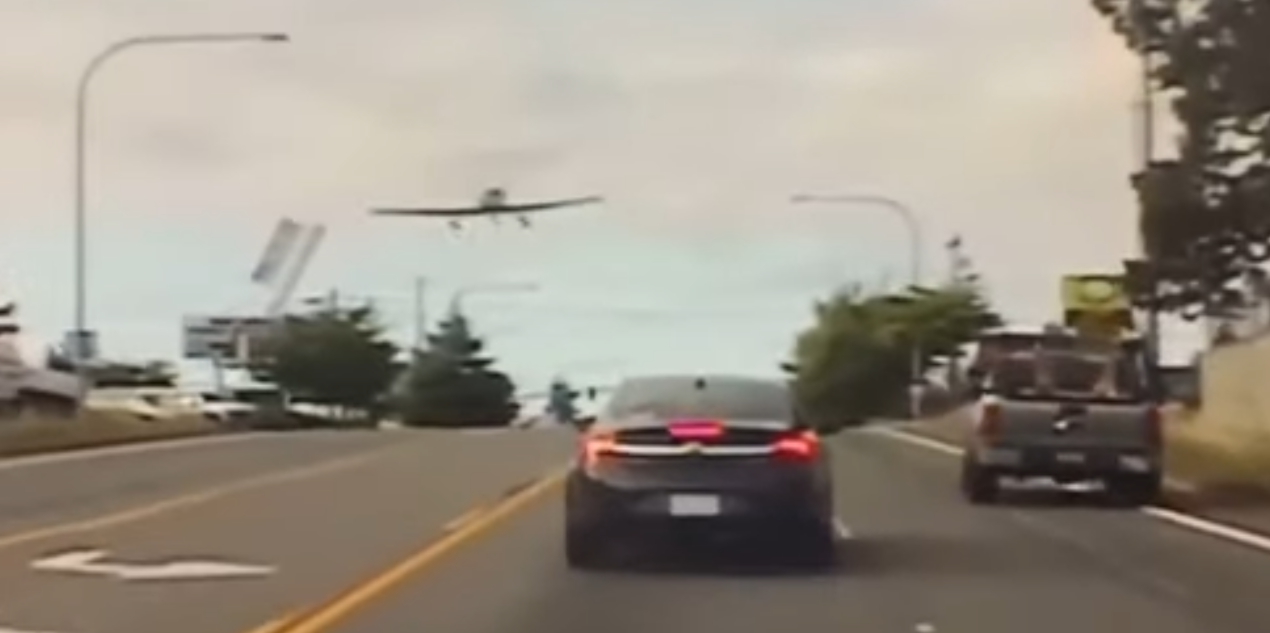 Как видно на записи с видеорегистратора, одноместный самолёт KR2 стремительно снижается над проезжей частью, распугивая едущих по своим делам водителей.