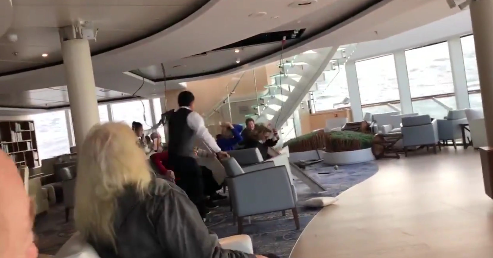 На видео можно увидеть, что корабль наклонился вбок, а из-за качки частично разрушился потолок.