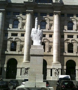 И так, первое место занимает «Памятник среднему пальцу», который установлен в Милане (Италия) рядом с Миланской фондовой биржей. Автор сего шедевра Маурицио Каттелану. Он придумал и воплотил в жизнь скульптуру кулака с средним пальцем высотой 4 метра, который установлен на постамент высотой 7 метров для выставки «Против идеологии». Изначально предполагалось, что «Средний палец» простоит всего лишь несколько дней, до завершения выставки, но сроки постоянно отодвигались, к большому разочарованию сотрудников Фондовой биржи.
