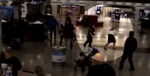 Инцидент сняли камеры видеонаблюдения. На кадрах видно, как неизвестная женщина в малиновой шляпе подходит к коляске с маленькой девочкой, которую везет ее мать, и хватается за нее. Мать отогнала невменяемую пассажирку, а та подняла на руки второго ребенка и бросилась с ним бежать.