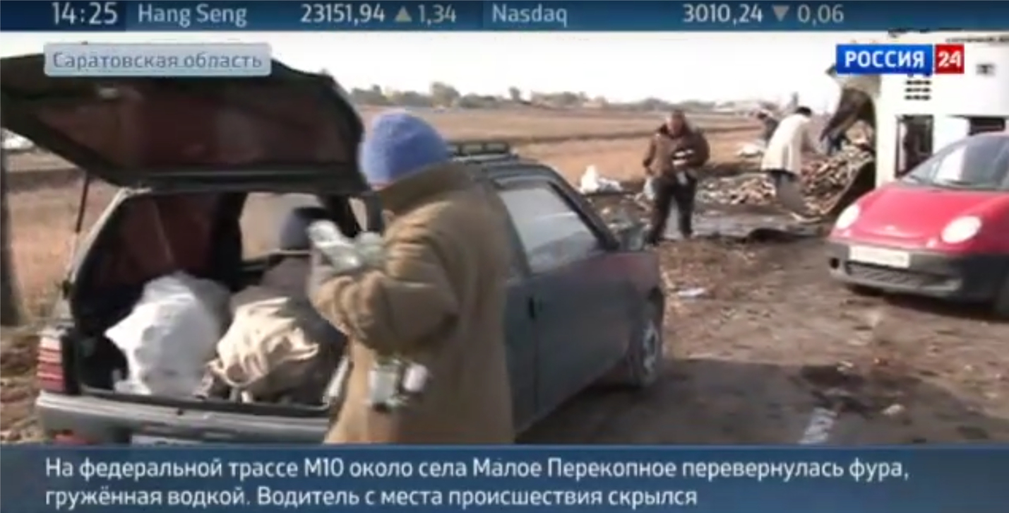 О том, что произошло потом, рассказала очевидец происшествия Екатерина Пахомова: «Крупное ДТП. Головы отвернули, думаем: ну, сейчас что-то страшное. На самом деле, смешно оказалось. Подъезжаем, смотрим — перевернулась и загорелась фура. И вот столько водки! Видите, грузят машины, еле уезжают у них машины».