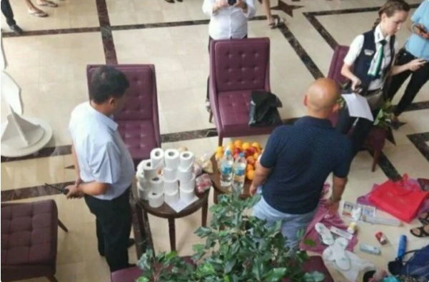 «Русские туристы при выезде из отеля были остановлены сотрудниками данного отеля, в ходе чего было выяснено, что они пытались вывезти из отеля почти все: туалетную бумагу, апельсины, перелитый по бутылочкам Бейлиз, печенье, персики и даже цветы с корнями», — сообщили очевидцы в паблике «Типичный турист» в социальной сети «Вконтакте», прикрепив видео изъятия.