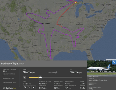 Boeing Dreamliner 3 августа поднялся в небо и отправился по необычному маршруту. На протяжении нескольких часов самолет описывал траекторию-силуэт того же самого Boeing Dreamliner. То есть, по сути лайнер нарисовал в воздухе схематическое изображение себя.