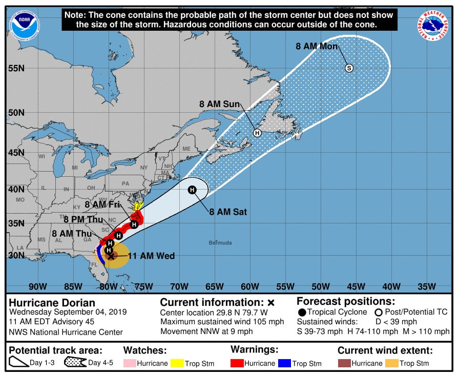 Как заявляют в Национальном центре по наблюдению за ураганами, шторм, скорость ветра внутри которого составляет 165 км/ч, двигается со скоростью 13 км/ч. Ожидается, что в течение дня «Дориан» окажется в «опасной близости» от побережья Флориды и Джорджии. Штаты Северная и Южная Каролина окажутся в опасности в четверг и пятницу.