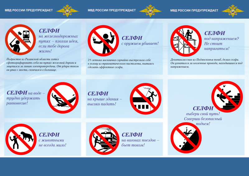 Опасными для съемки селфи местами, по мнению МВД России, являются автомобиль, дорога, горы и водоемы. Каждая иллюстрация на графических плакатах сопровождается лозунгом, для более яркого эффекта. Так, например, графическое предупреждение не снимать селфи возле силовых линий сопровождается комментарием «Селфи под напряжением? Не стоит напрягаться?».