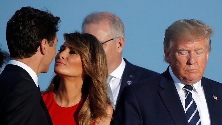 Трюдо и жена американского президента Меланья, которая встала между ним и своим супругом, также поцеловали друг друга в щёку.